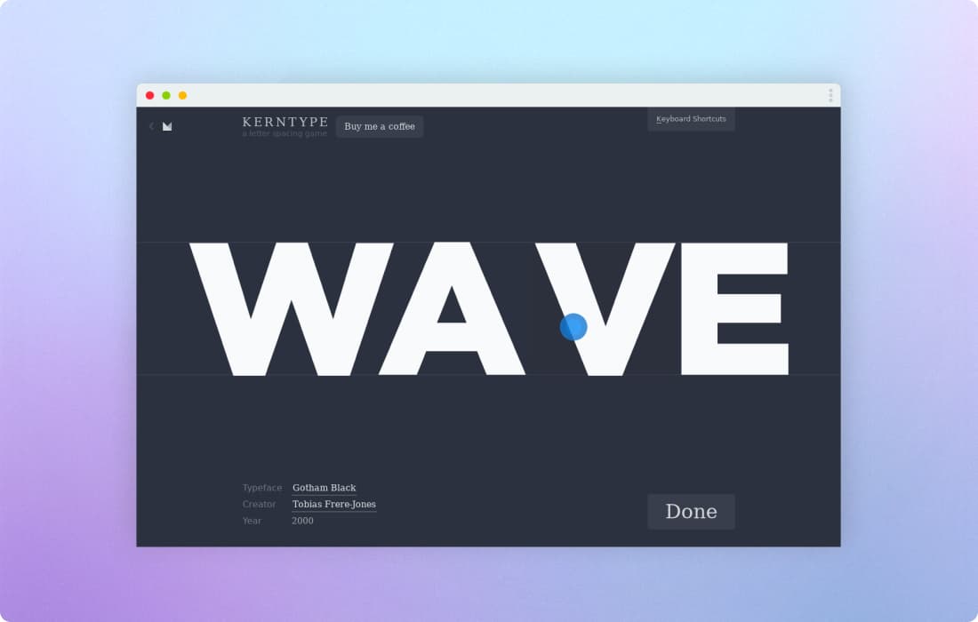Il s'agit d'un site web qui vous propose de jouer avec le crénage des caractères. Le jeu consiste à déplacer les lettres d’un mot ou d’une phrase pour obtenir un espacement harmonieux et équilibré. Par exemple, vous devrez ajuster le crénage des mots “TYPE”, “WAVE” ou “VOGUE” en utilisant différentes polices de caractères. Le jeu se déroule en 10 étapes de difficulté croissante. À chaque étape, vous obtenez un score sur 100 en fonction de la proximité de votre solution avec celle d’un expert en typographie.